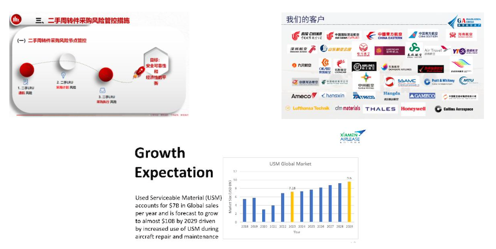 厦飞租海外市场专员也在会上视频发言,用数据展望了未来的二手件前景,并展开了二手航材在全球市场的广泛接受度。也对未来国内航司使用二手件USM所需要建立的履历系统和长期可持续的流转程序提出了借可学习的参考依据及建议。 信泰航空技术股份有限公司作为产业链重要维修单位也引“什么是基于共享的航材的保障综合服务?”为话题进行了一系列的探讨和展望。
